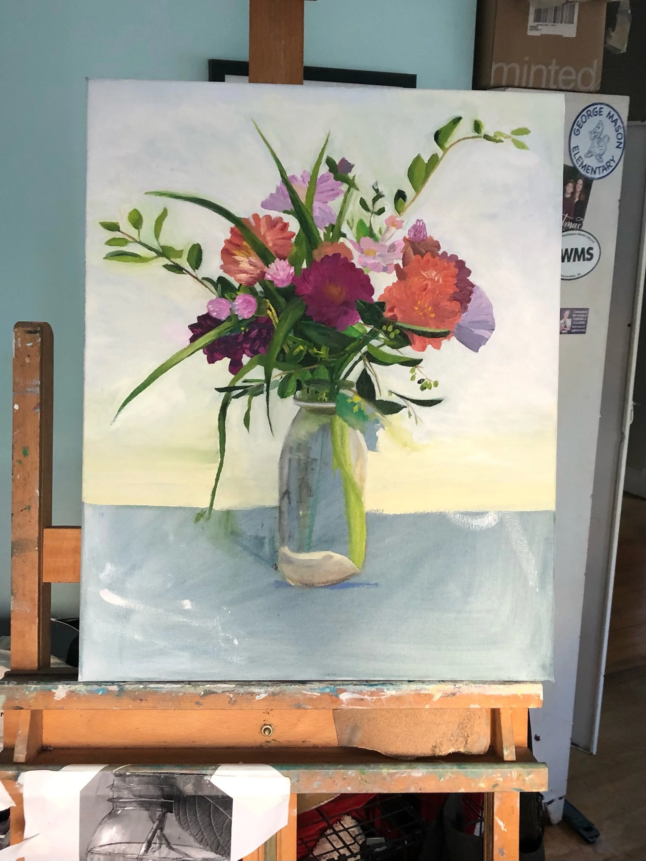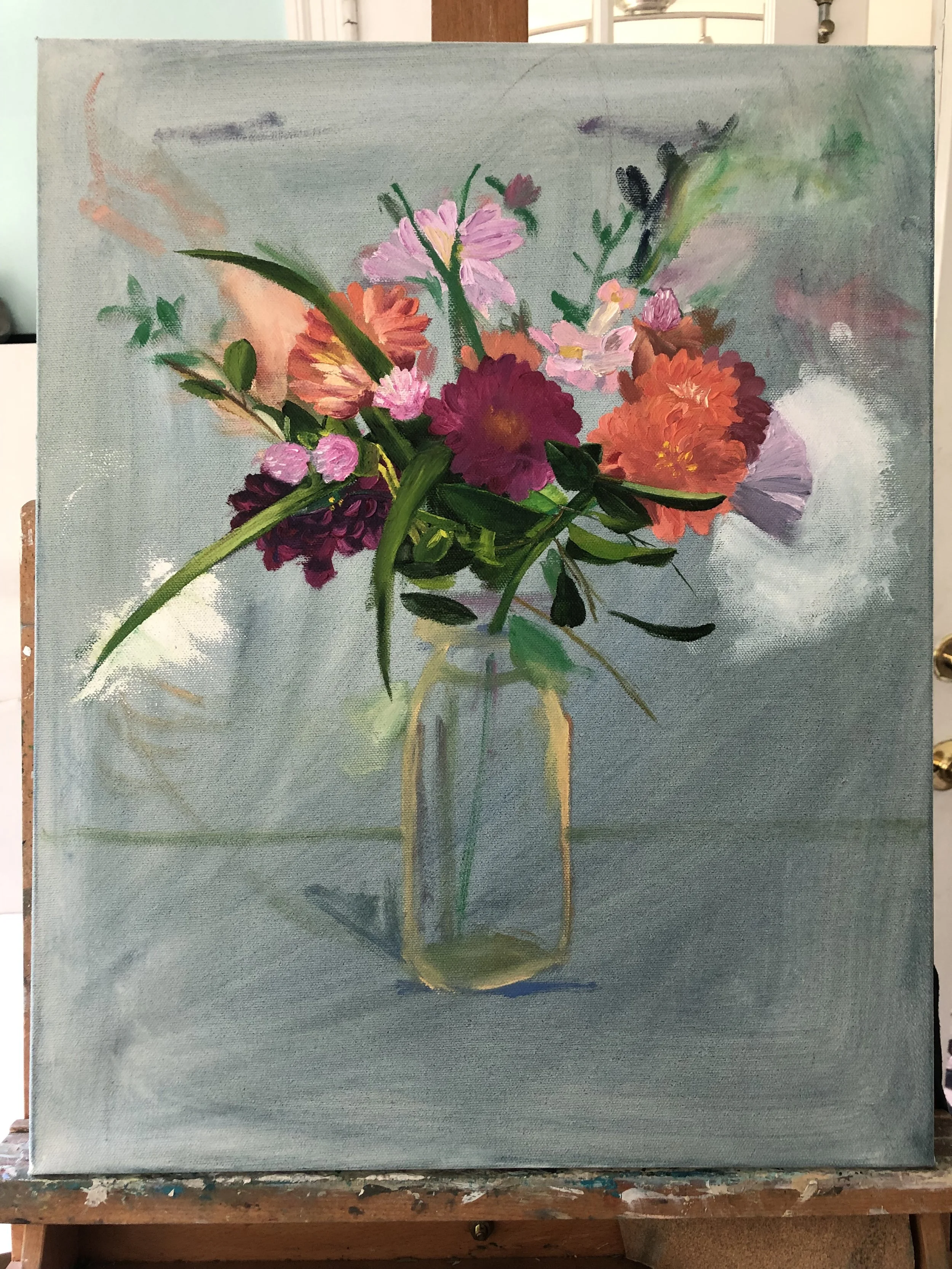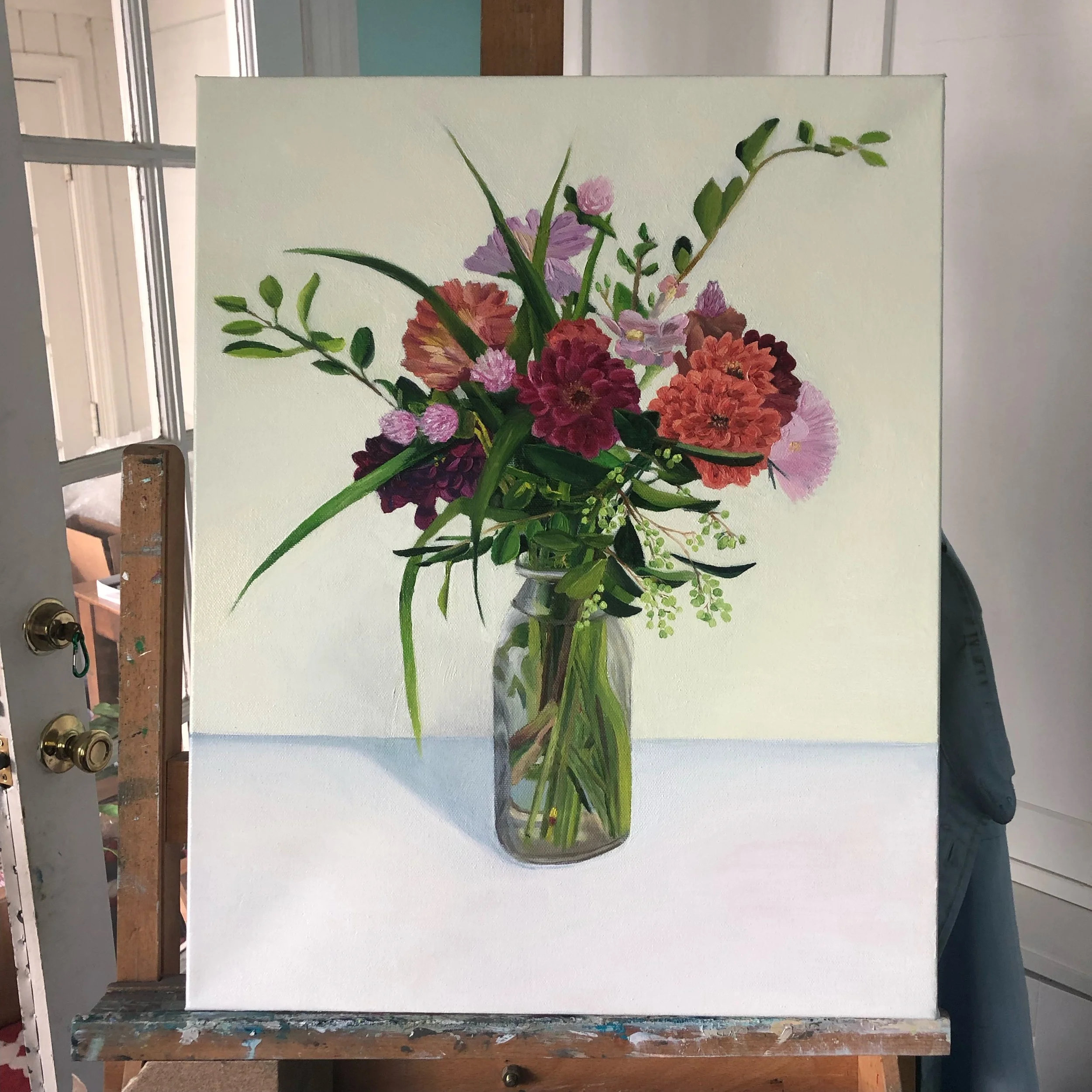 Two years ago, ChildOne stopped by after going to the farmers market. She brought a beautiful bouquet of flowers she’d picked up which I promptly took to paint. The painting itself took me around 40 hours to complete.