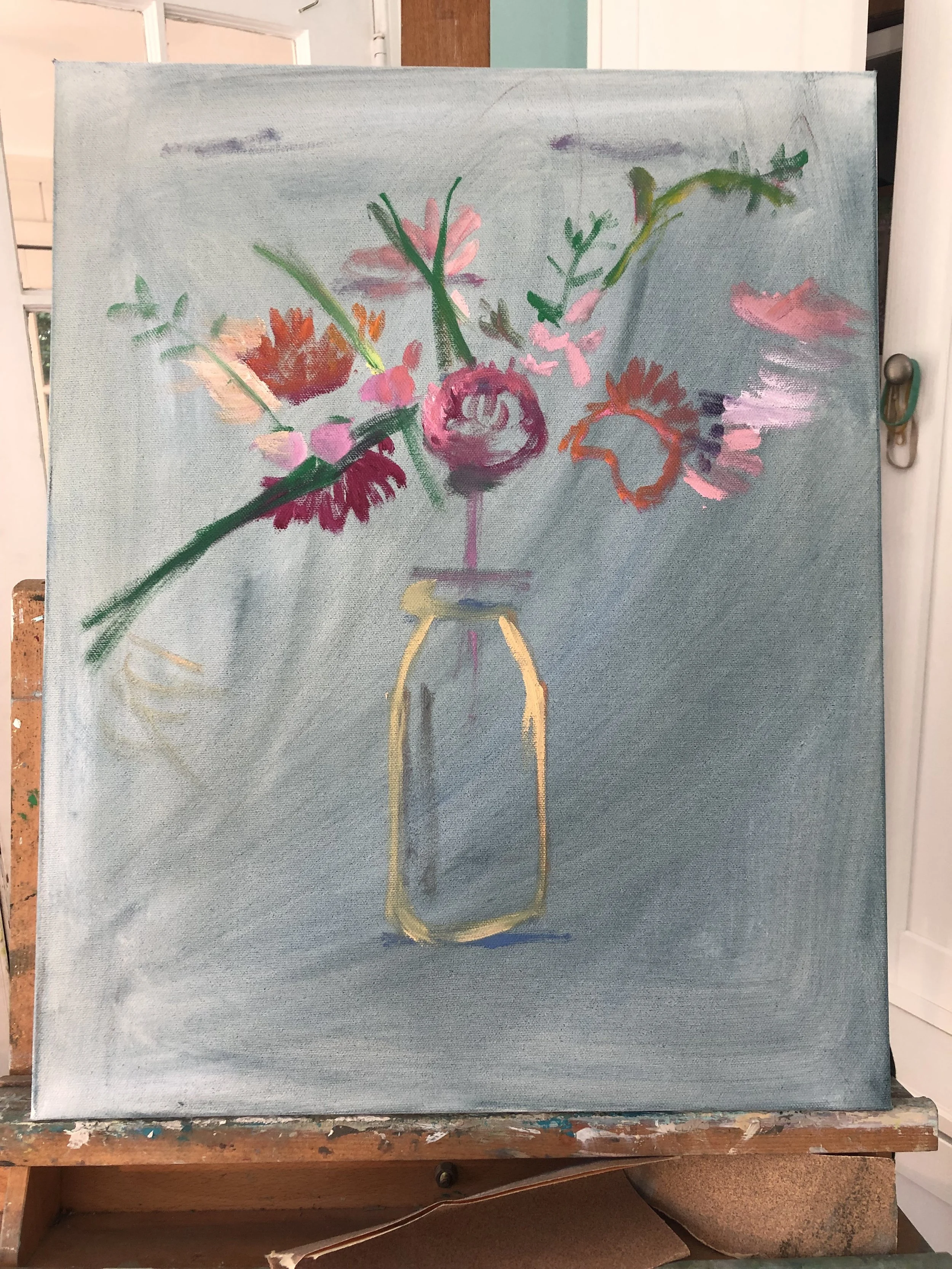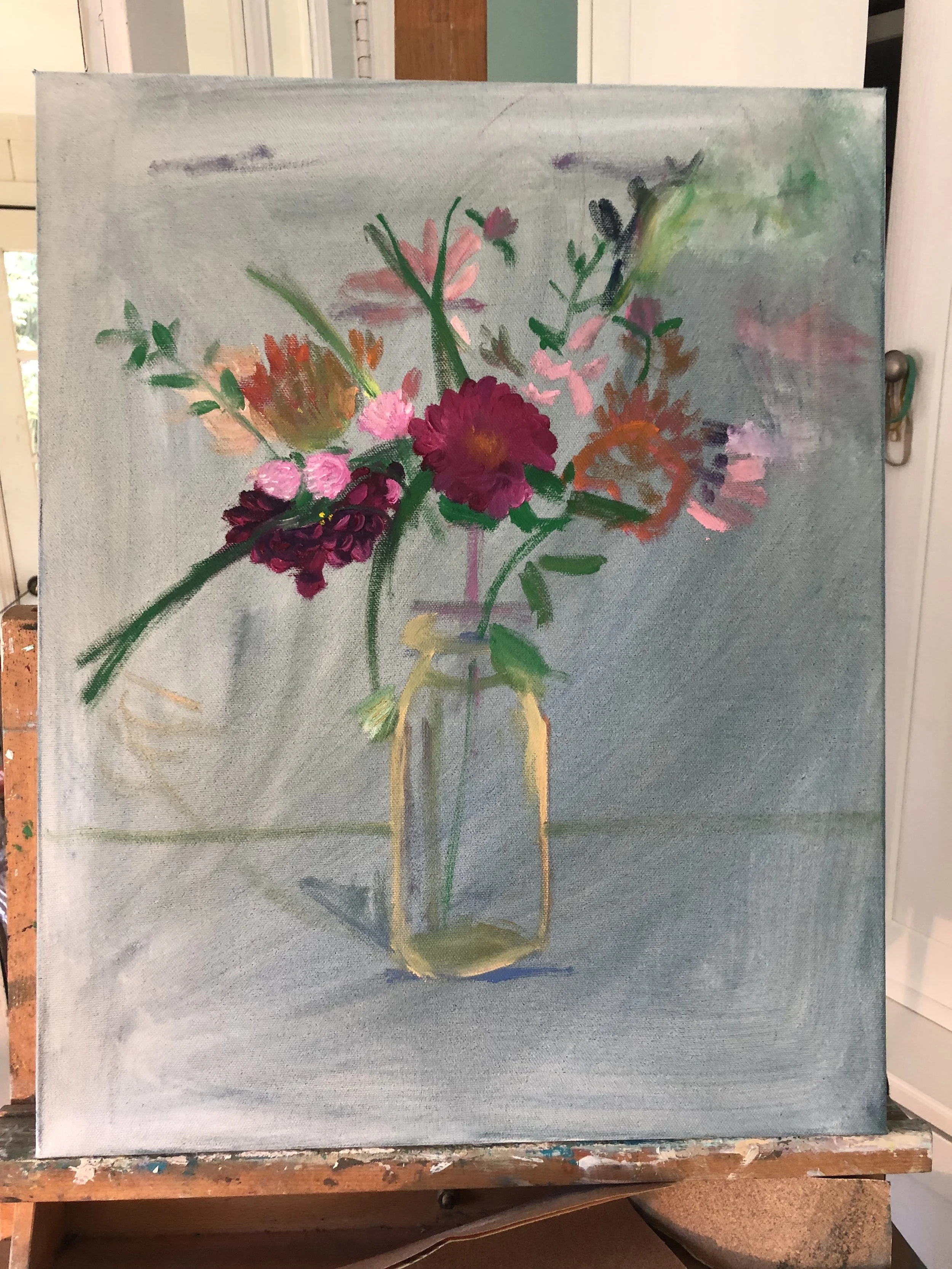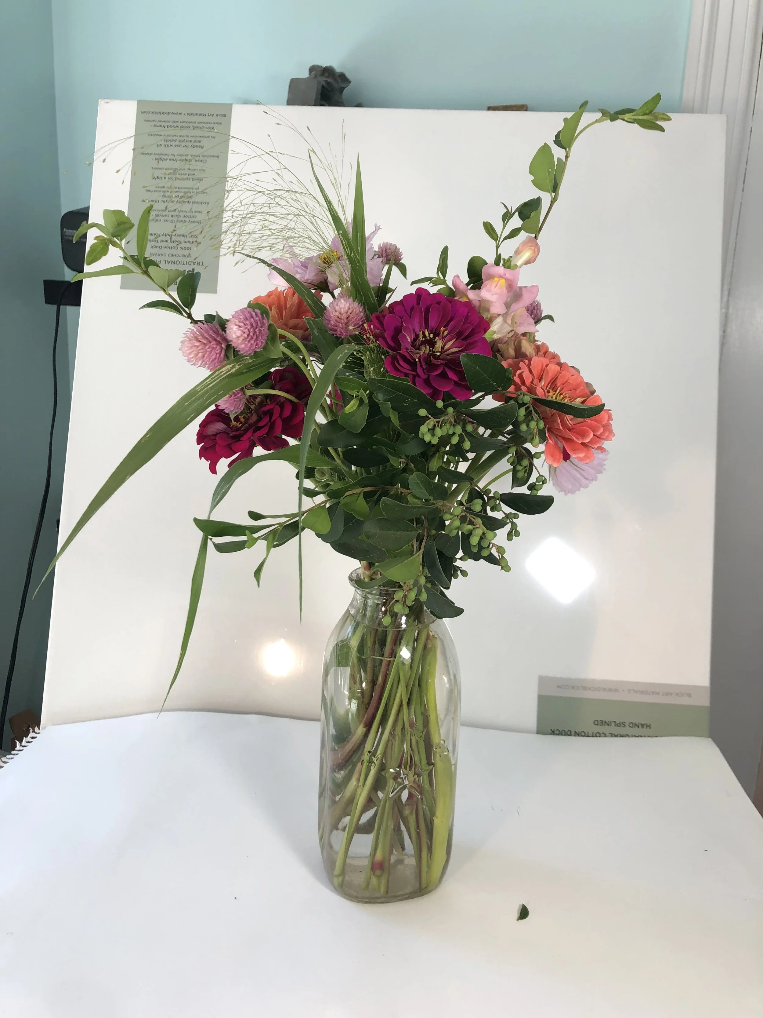 Two years ago, ChildOne stopped by after going to the farmers market. She brought a beautiful bouquet of flowers she’d picked up which I promptly took to paint. The painting itself took me around 40 hours to complete.